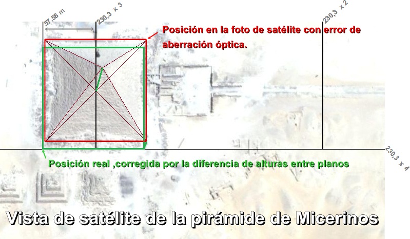 Se deben corregir ambos errores desplazando en dirección opuesta el cuadrado de la base de las dos pirámides en esas diferencias. El presente estudio, en su versión original detallada, contempla estos efectos. De no aplicarlos, el lado sur de la pirámide de Micerinos no coincidiría con el extremo sur de la cuadrícula, como se observa en la siguiente imagen.